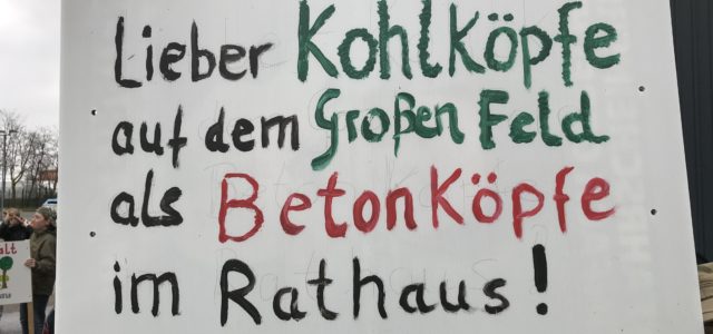 Große Demo „5 vor 12!“ Gegen Flächenfraß & Industrie 16. März 201918. März 2019 Demotauglich und humorvoll: Die Rufe zum skandieren! Am Samstag, 16 März 2019, fand unter dem Motto „5 vor 12 – Flagge zeigen gegen Klimaschmutz + Flächenfraß“ die große Demonstration gegen das geplante menschen- und umweltfeindliche Industriegebiet „Große Feld/Langenberger Straße“ statt. Mehr als 250 Menschen und fast 20 Traktoren zogen durch die Velberter Innenstadt bis zum Platz am Offers. Mit lautstarken Hupen, Trommeln und Pfeifen zeigten die Velberter Demonstranten deutlich, was sie von dem unzeitgemäßen Großprojekt der Velberter GroKo aus CDU und SPD halten: Nix! Organisiert wurde die Demo durch die Bürgerinitiative „Große Feld Velbert“ mit breiter Unterstützung von vielen Bürgerinnen und Bürgern, Verbänden, Organisationen und Parteien. So beteiligten sich neben Grünen auch Linke, Piraten und die FDP. Auch die Grüne-Jugend und die Jusos waren dabei. Bei der Abschlusskundgebung wurde hervorgehoben, dass die Velberter GroKo noch immer in der Vergangenheit lebt, statt eine attraktive moderne Wirtschafts- und Standortpolitik aktiv zu gestalten. Hier einige Impressionen von der Demo! Motivwagen
